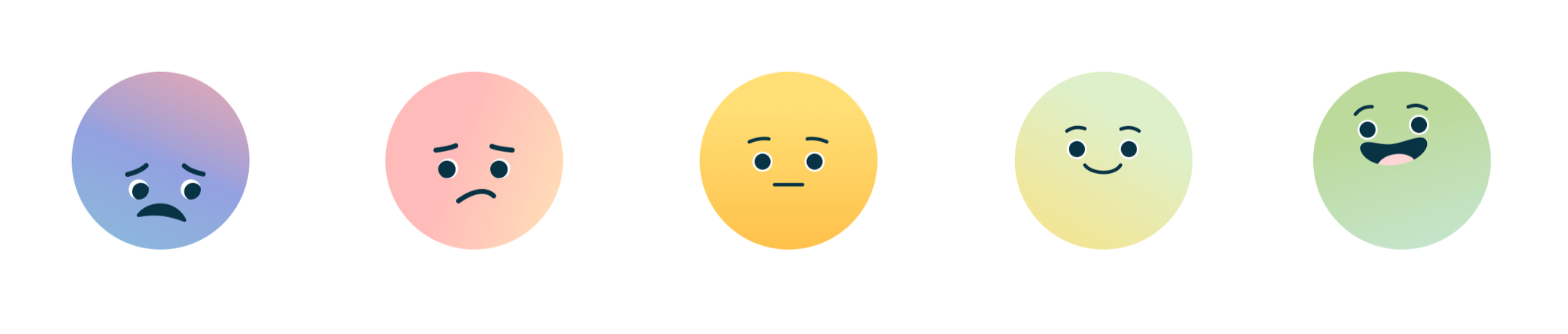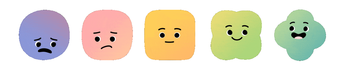 The mood meter featured a straightforward five-slot rating system that depicted a spectrum of emotions from negative to positive. Inspired by similar “satisfactory” rating scales, it included emotive characters representing various moods on the scale. My goal was to make the visuals genuinely reflect what someone might be feeling at that moment by using color and motion, creating an engaging and visually appealing interaction.