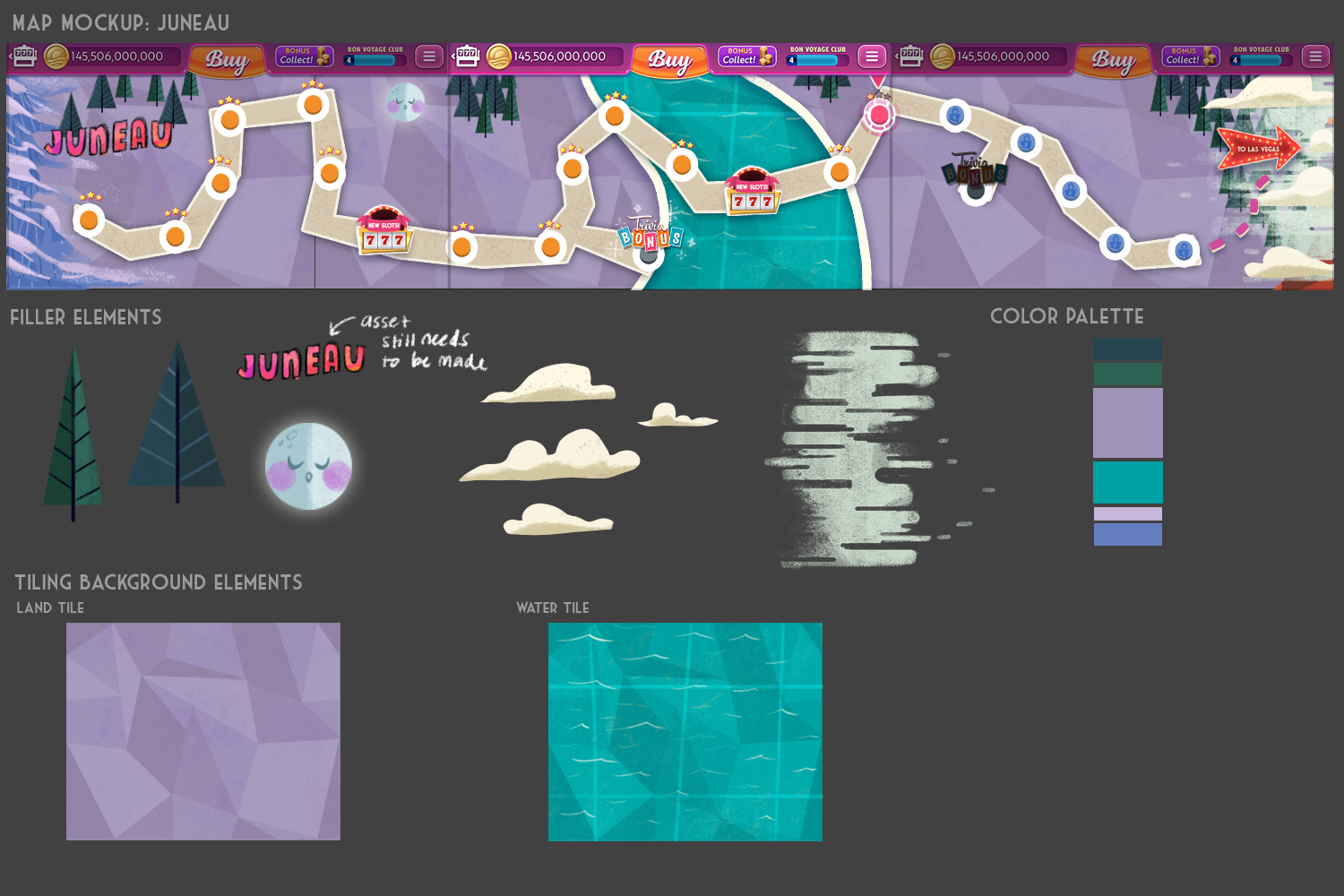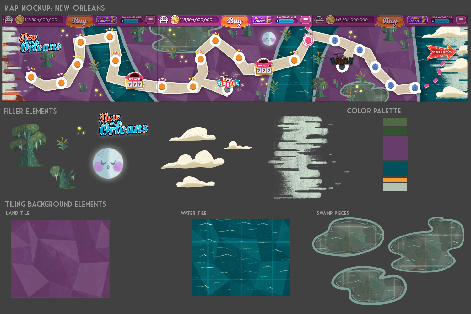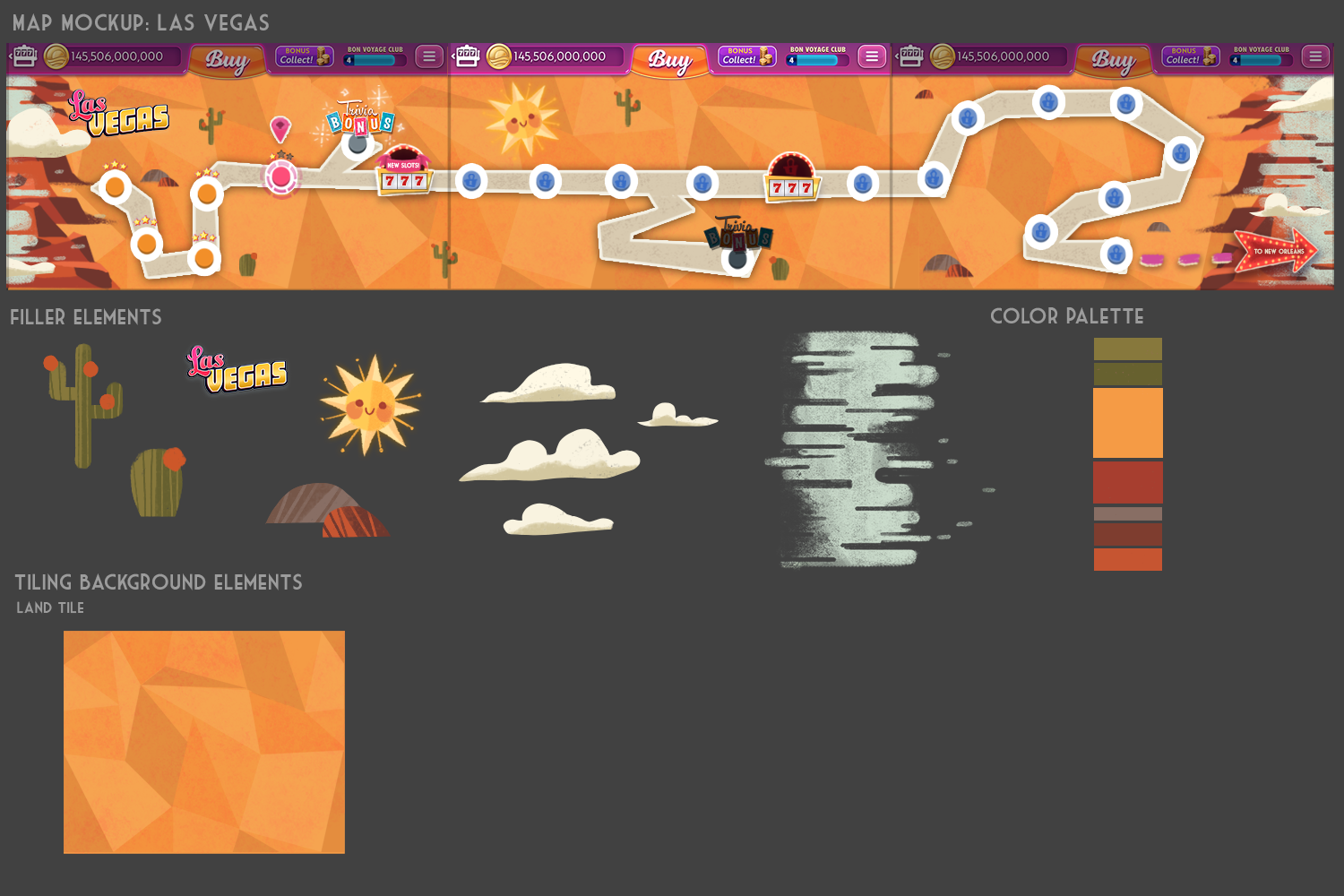 This project was a new mobile experience next to the classic Big Fish Casino app. This game captured the novelty of traveling to different iconic cities, collecting postcards and souvenirs along the way, while the player progresses through the map of the city they’re in. I joined this project during its development to help direct the look and feel of the game. The art direction strategy for Sunset Riches took inspiration from mid-century design elements with contemporary polish for the mobile experience.