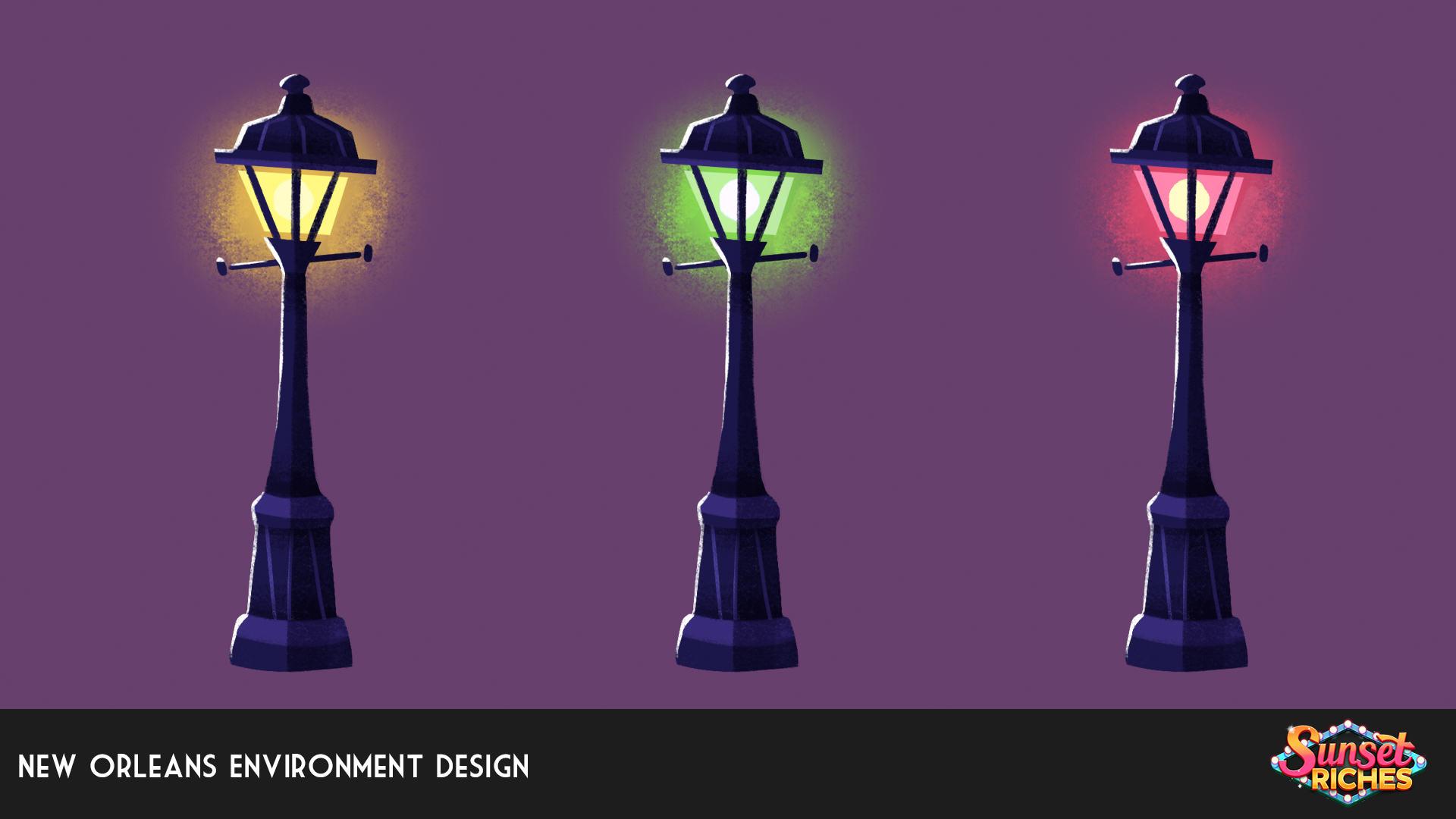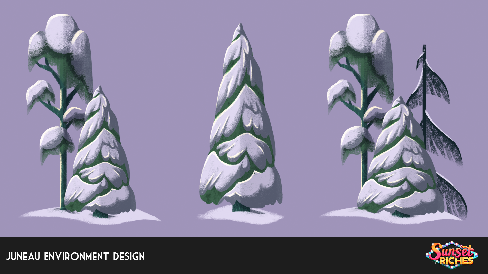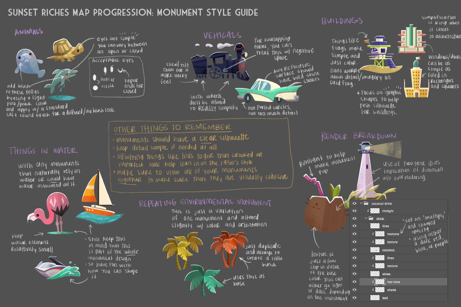Another aspect of this project was being able to create a style that other artists can recreate and have it look cohesive in the world of Sunset Riches. One of my key responsibilities in helping with the Art Direction of this project was to create a detailed style guide breaking down the overall design theory. Not only did this guide show how to create the actual look with textures and layer styles, but it also showed how to create an illustration with a particular situation in mind (e.g. things in water, simplifying for buildings, etc). This guide was handed to artists that would join the project for a short time to help illustrate the groups of souvenirs.