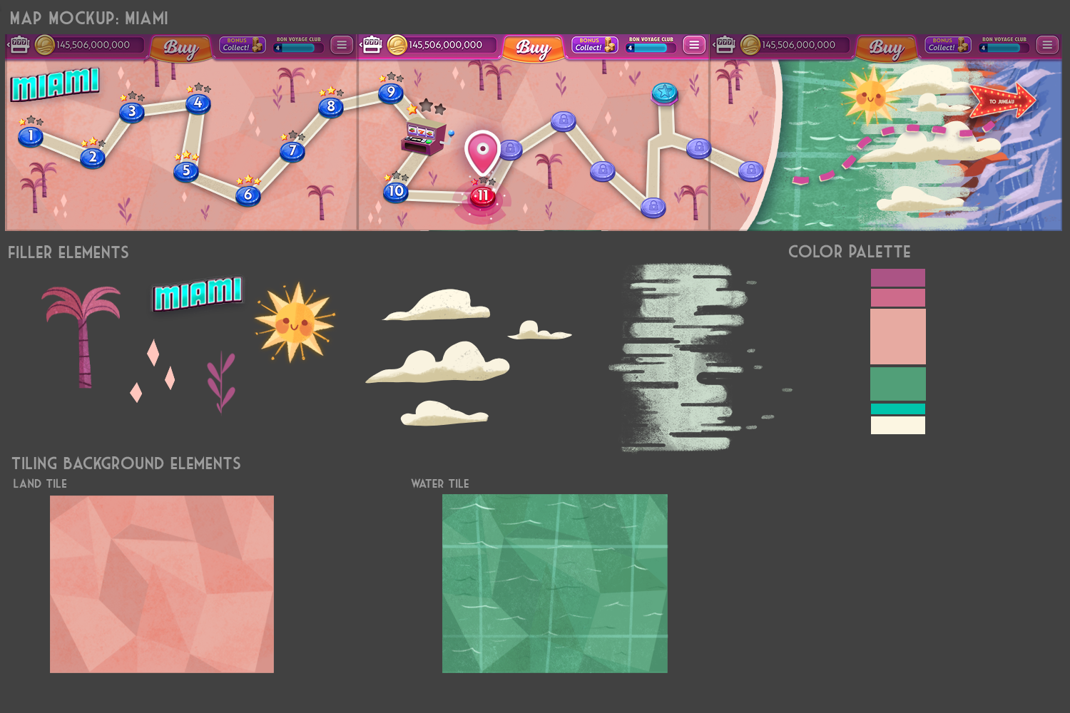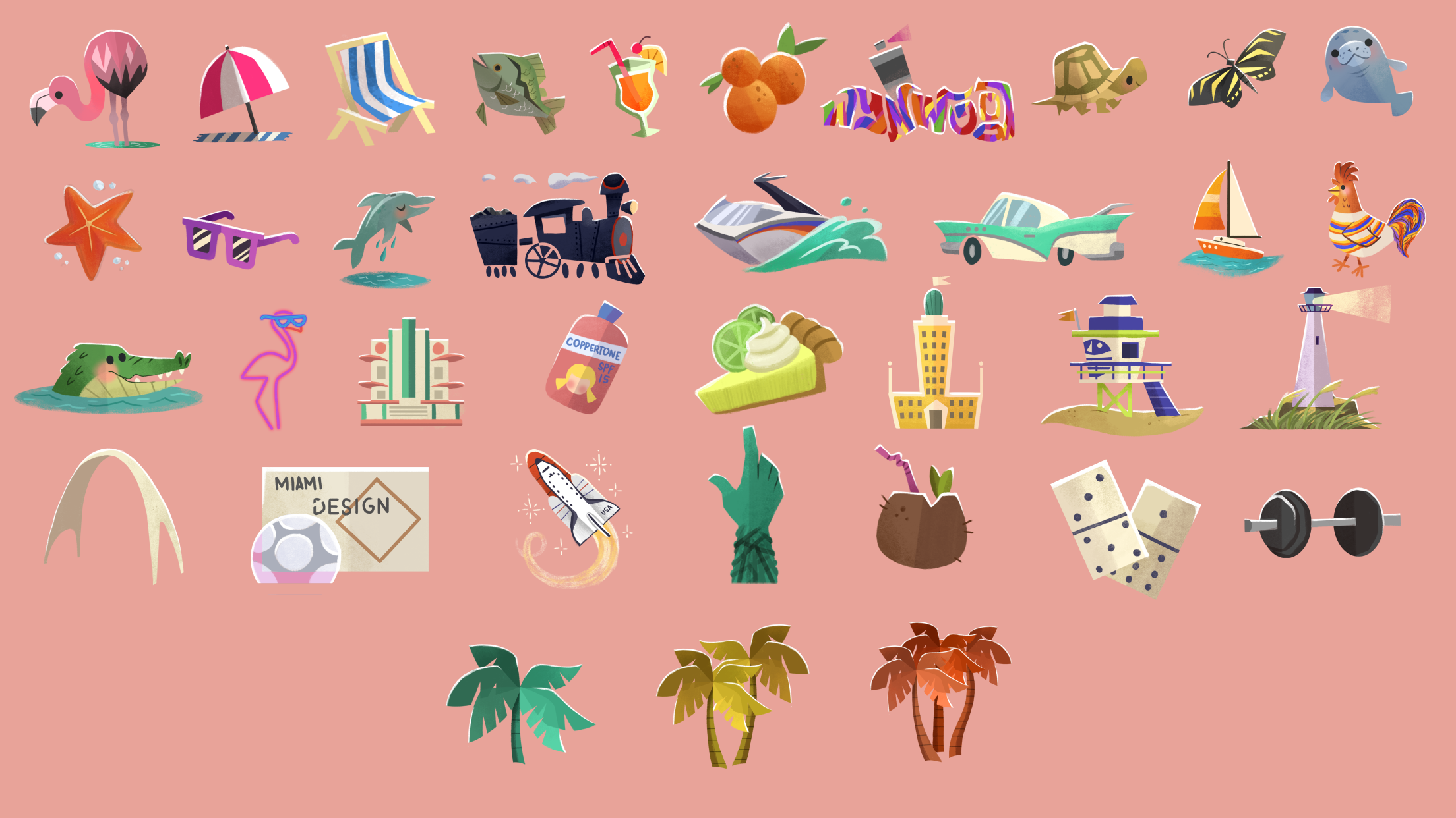Users going through the map experience would also collect little souvenirs along the way each time they complete a slot machine and progress forward. Each city had a set of 36 souvenirs that incapsulates and represents the city. From local food, animals, buildings, and activities, each city had its own unique set that wasn’t repeated in another city. This took in depth research to create a set for each city that felt truly representative of the diverse and unique aspects of the locale. Here is the set I designed with the other lead illustrator for the Miami map.